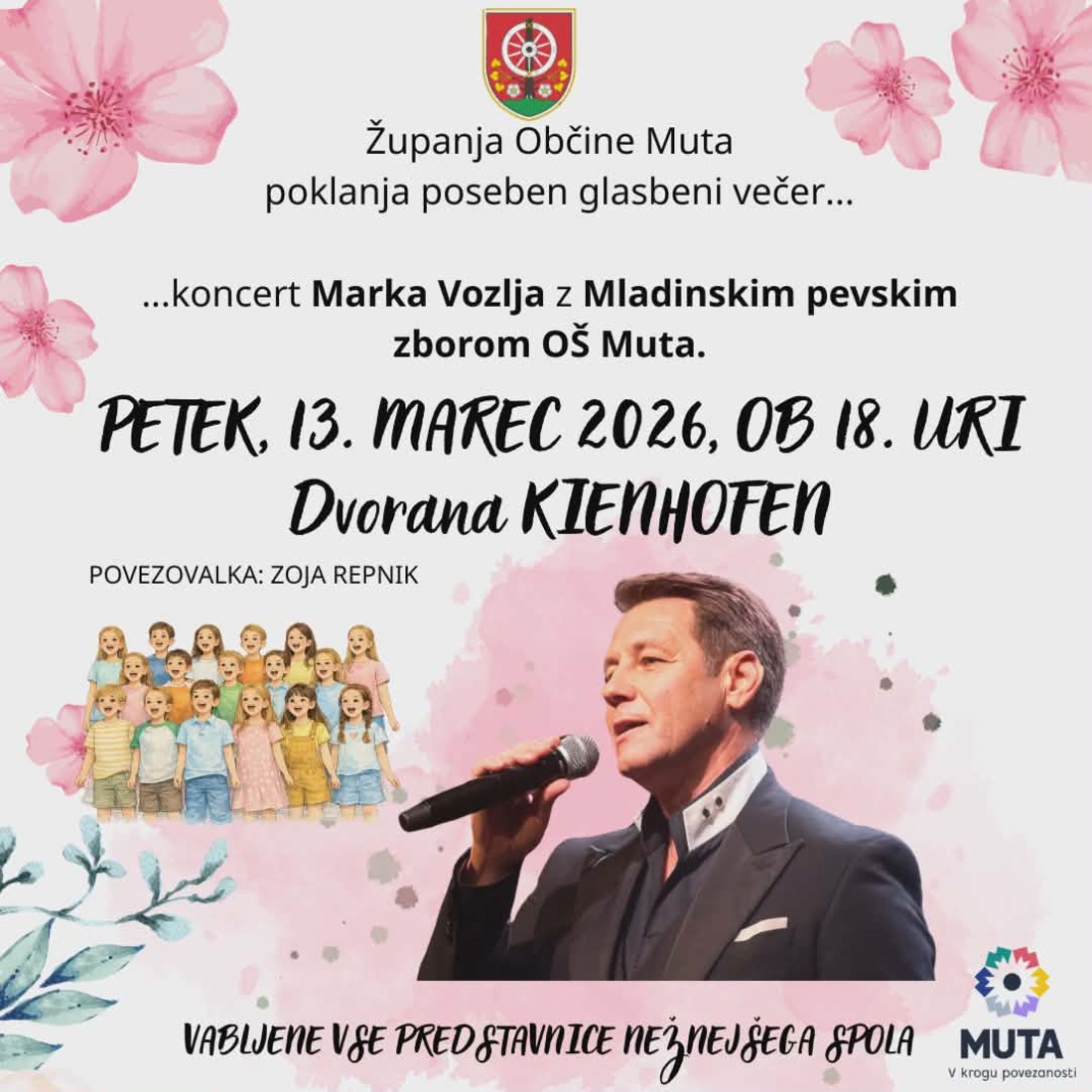 Županja Občine Muta vam podarja čudovit koncertni večer z Markom Vozljem in Mladinskim pevskim zborom OŠ Muta.