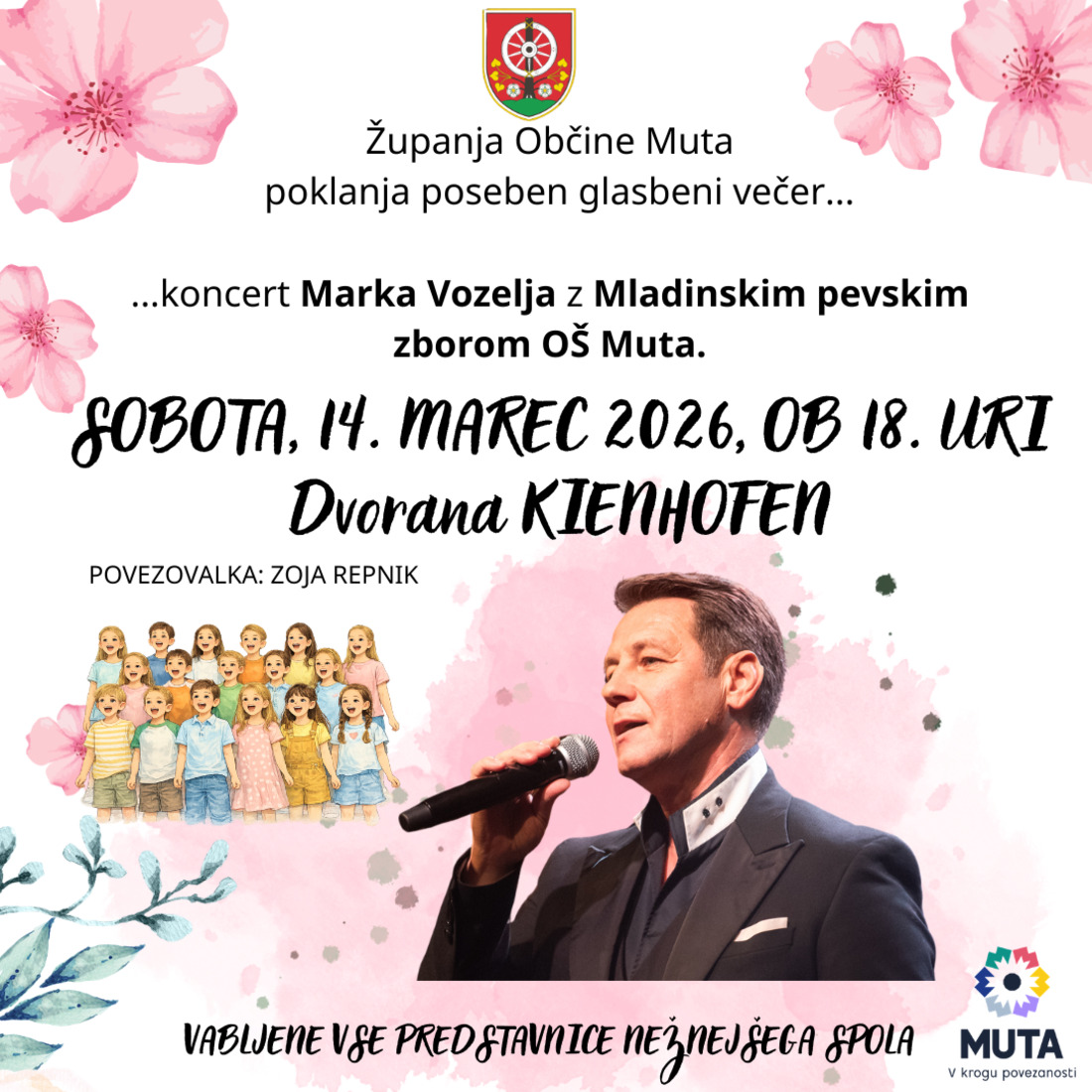 Županja Občine Muta vam podarja čudovit koncertni večer z Markom Vozljem in Mladinskim pevskim zborom OŠ Muta.