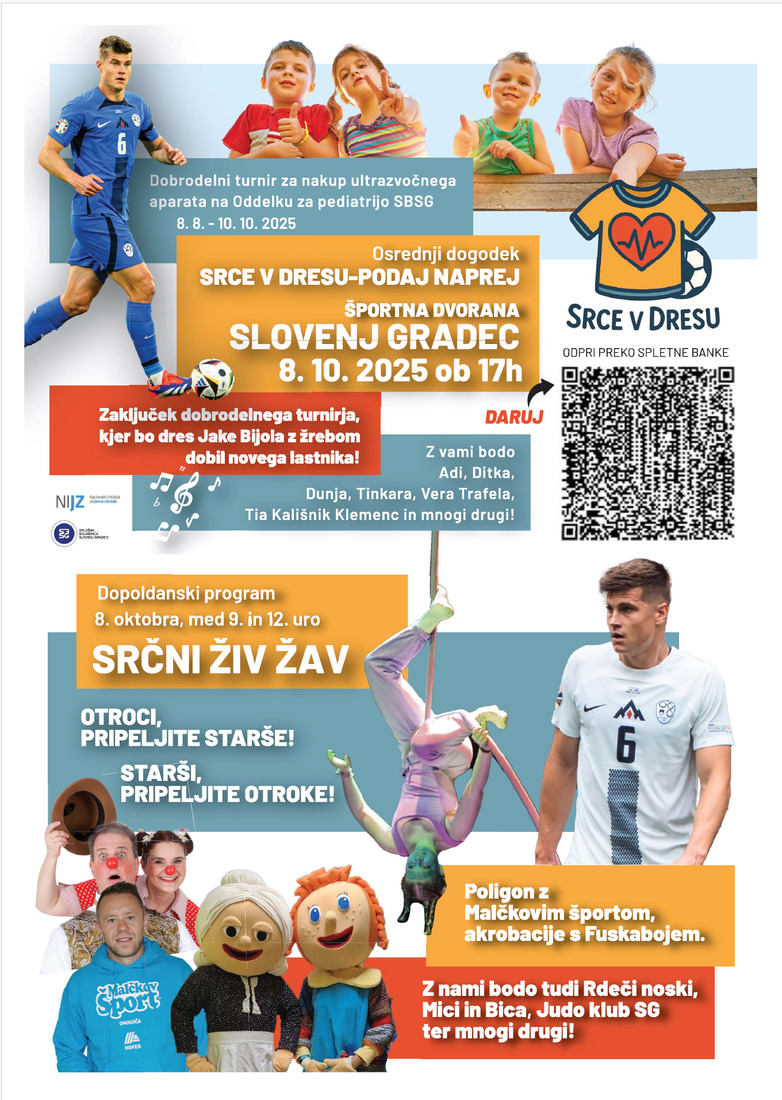 🕒 Ob kateri uri: praznovati začenjamo že dopoldne med 9.00 in 12.00 uro, ko bo potekal »Srčni živ žav«, s številnimi delavnicami in aktivnostmi za otroke, predvidoma na stadionu, v primeru slabega vremena pa v Športni dvorani. Popoldne pa nadaljujemo ob 17.00 uri, ko bo potekal osrednji dogodek »Srce v dresu – podaj naprej« z vsemi aktivnostmi.