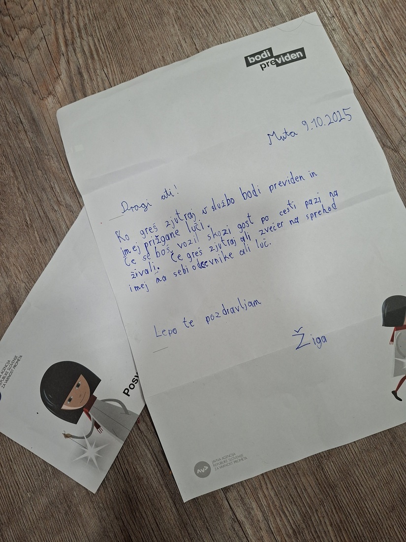 Vsako pismo so otroci vložili v kuverto z napisom »Posveti mi pozornost«, v notranjosti pa dodali sporočilo »Bodi previden«. S tem so na simbolen, a iskren način spomnili, kako pomembno je, da v prometu vidimo in smo videni.