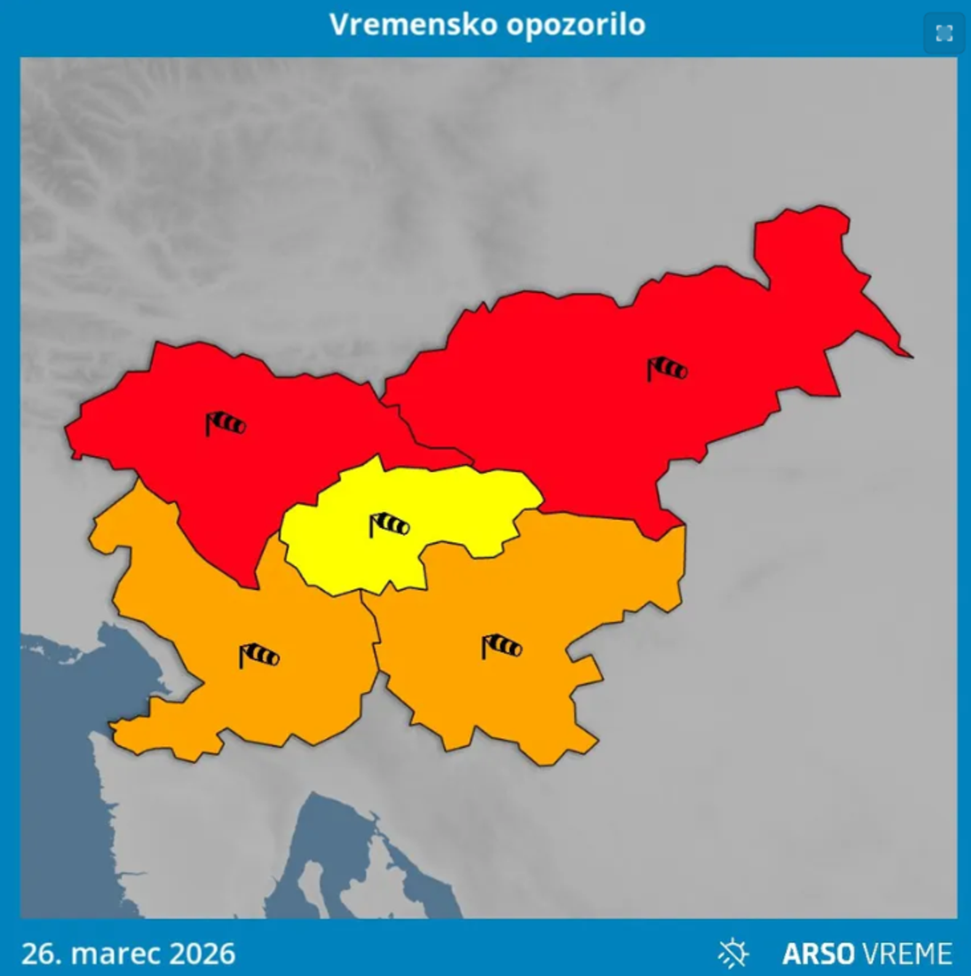 Agencija za okolje je zaradi močnega severnega vetra izdala rdeče opozorilo, saj lahko ta povzroča škodo na infrastrukturi, ovira promet ter predstavlja resno nevarnost za ljudi, premoženje in živali. Sunki vetra nad 100 km/h lahko lomijo veje, podirajo drevesa, odkrivajo strehe, povzročajo prekinitve v oskrbi z električno energijo ter zaradi letečih predmetov močno otežijo in ponekod nevarno ogrozijo gibanje na prostem. Ob najvišjih opozorilih je gibanje na prostem nevarno oziroma smrtno tvegano, zato pozivamo k povečani previdnosti, spremljanju meteoroloških opozoril ter doslednemu upoštevanju navodil pristojnih služb. Priporočamo, da pravočasno poskrbite za zaščito sebe, svojcev, domačih živali ter zavarujete stanovanjske objekte in vozila.